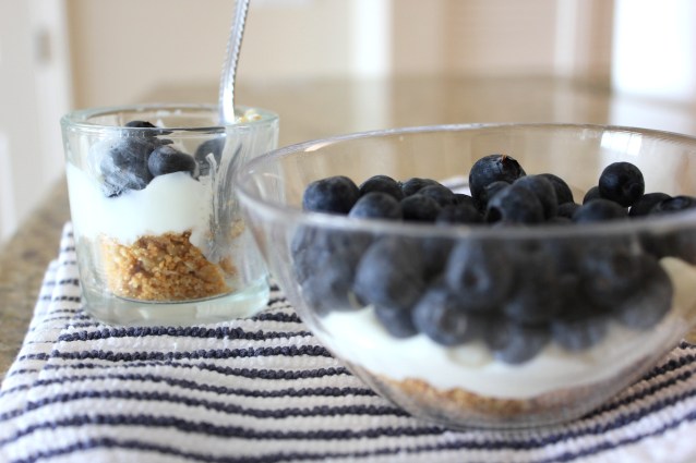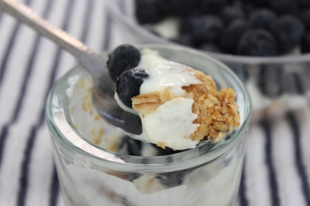 In individual small bowls, mason jars or whatever you have on hand, add a couple spoonfuls of cooled walnut oat mixture, add a couple spoonfuls of cream cheese mixture and then add blueberries. Sprinkle any extra crust crumbs over the blueberries. Cover and refrigerate until ready to serve.
