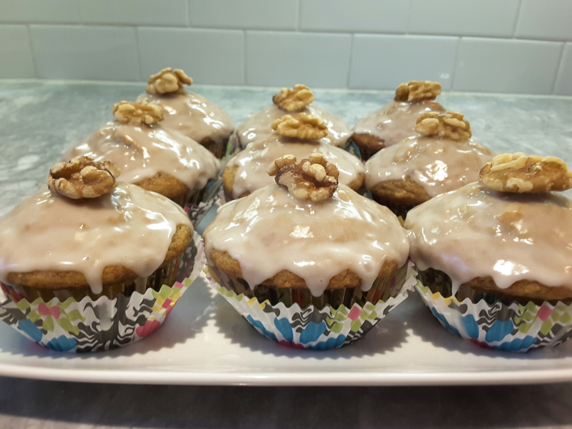 5. Once cooled, mix the icing sugar and orange juice until smooth. Dunk the top of each muffin into the glaze mixture, allowing the excess glaze to drip off. Decorate each muffin with a walnut piece. Enjoy!