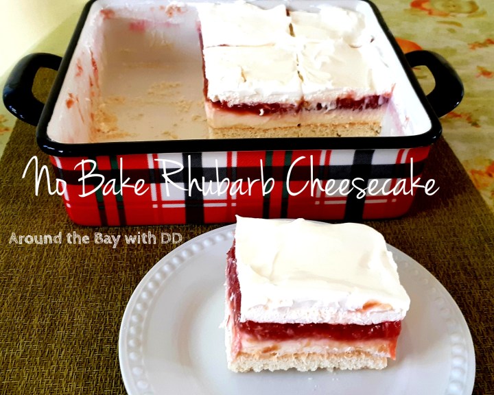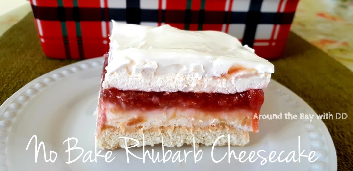 This recipe for No Bake Rhubarb Cheesecake came about when I went to make my mom’s no bake cheesecake recipe and discovered that I didn’t have any Cool Whip. So I decided to make the cheesecake base without the cool whip, I then added a layer of homemade Rhubarb Jam and finished it off with a layer of cool whip once I bought some. And to start it all off, I used Purity Lemon Creams Biscuits for the base. If you don’t have access to Purity products (made in Newfoundland; also found online), you can use graham wafers or another cookie that would work well with rhubarb ~ coconut cookies work be delicious!