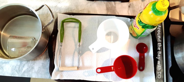Fill your canning pot with hot water, add your cooling rack to the bottom then add your pint and quart jars to the water. Bring water to a boil and sterilize jars for 10 minutes.