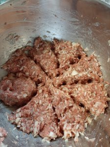 - Mix the ground beef, rice, onion, milk and salt and pepper until thoroughly combined. TIP~I put this is my KitchenAid mixer with the flat paddle and let it do the work for me. See pic below to see how I portion meat mixture.