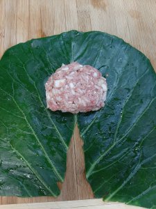 No better time than now to use up your big heads of cabbage and those big cabbge leaves from your garden. If you are just using the leaves, pop them in the freezer for a bit so some of the water evaporates and it will make the leaves softer and easier to roll. Let them come back to room temperature while you are making your sauce and filling or pop then in a large pot with a little water and steam for 4 minutes.***Cut out cabbage ribs before steaming.