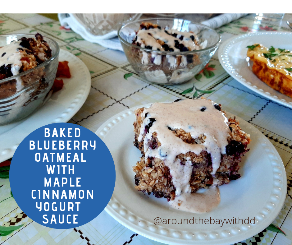 I am also that person that if I’m going somewhere and it’s a special occasion, in this case, my father in law’s birthay, I like to take over breakfast and make brunch to make their day extra special. For his birthday brunch, I made this Baked Blueberry Oatmeal, with Wild Newfoundland Blueberries, but instead of plain maple syrup I made a Maple Cinnamon Yogurt Sauce that took this dish from good to WOW! So much flavor from the cinnamon and maple and the greek yogurt added some protein to up the nutritional value.