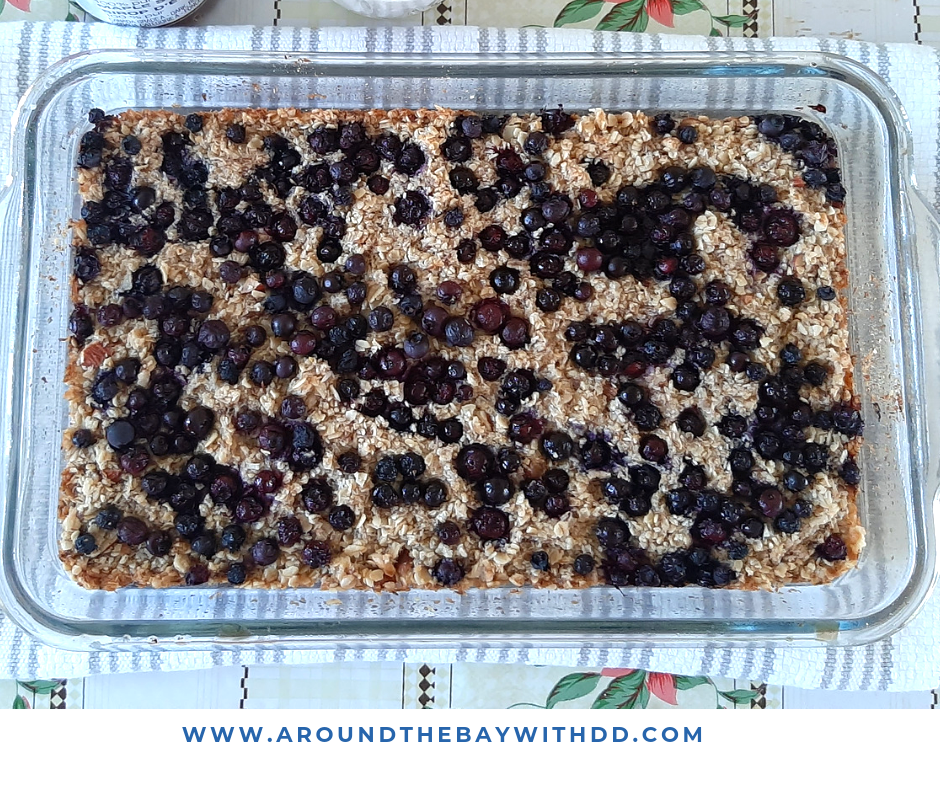 In a large bowl, mix together the rolled oats, coconut, ground flaxseed, chopped roasted almonds, salt, baking powder and cinnamon. Stir well to combine all ingredients. Pour wet ingredients over the oatmeal mixture. Stir to combine then add 1 cup of blueberries, stir and pour into your prepared pan. Top with the remaining 1/2 cup blueberries. If using frozen blueberries, DO NOT THAW!