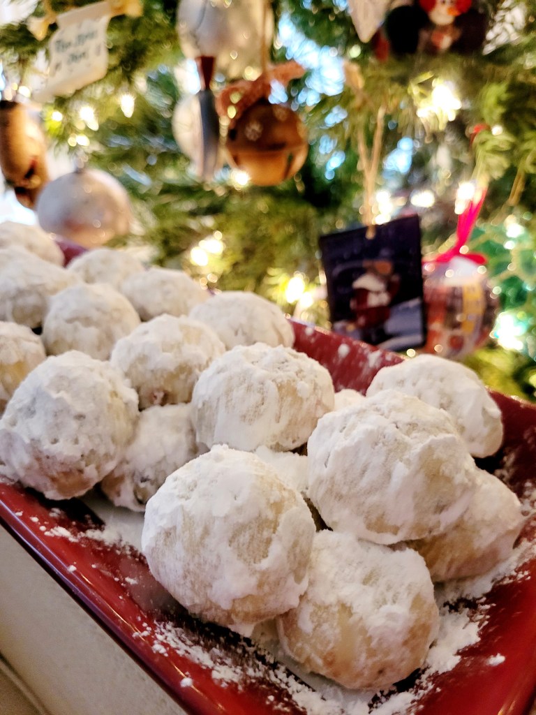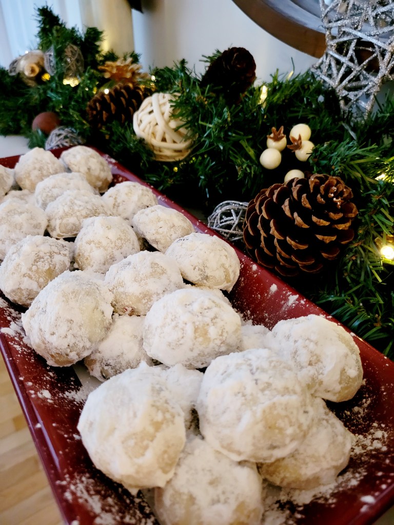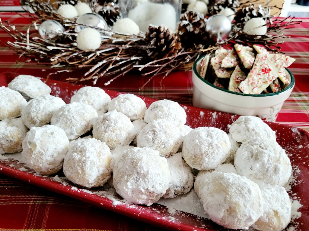 Ok, now onto the BEST part, Christmas Cookies! I just started my baking this week and one of the first things I made were these Peppermint Bark Snowballs. I used my absolute favorite Pecan Sandies recipe but instead of using pecans, I used chopped up peppermint bark instead. I wanted to use peppermint candy canes but for the life of me I could not find any anywhere!! Must be one of those products that there is a shortage of this year! So I used the peppermint bark instead and I’m not mad about it at all! YUMMY. Slighly lightly pepperminty. A snowy addition to your cookie platter.
