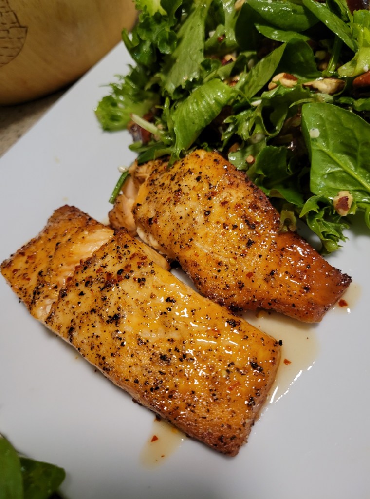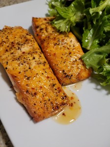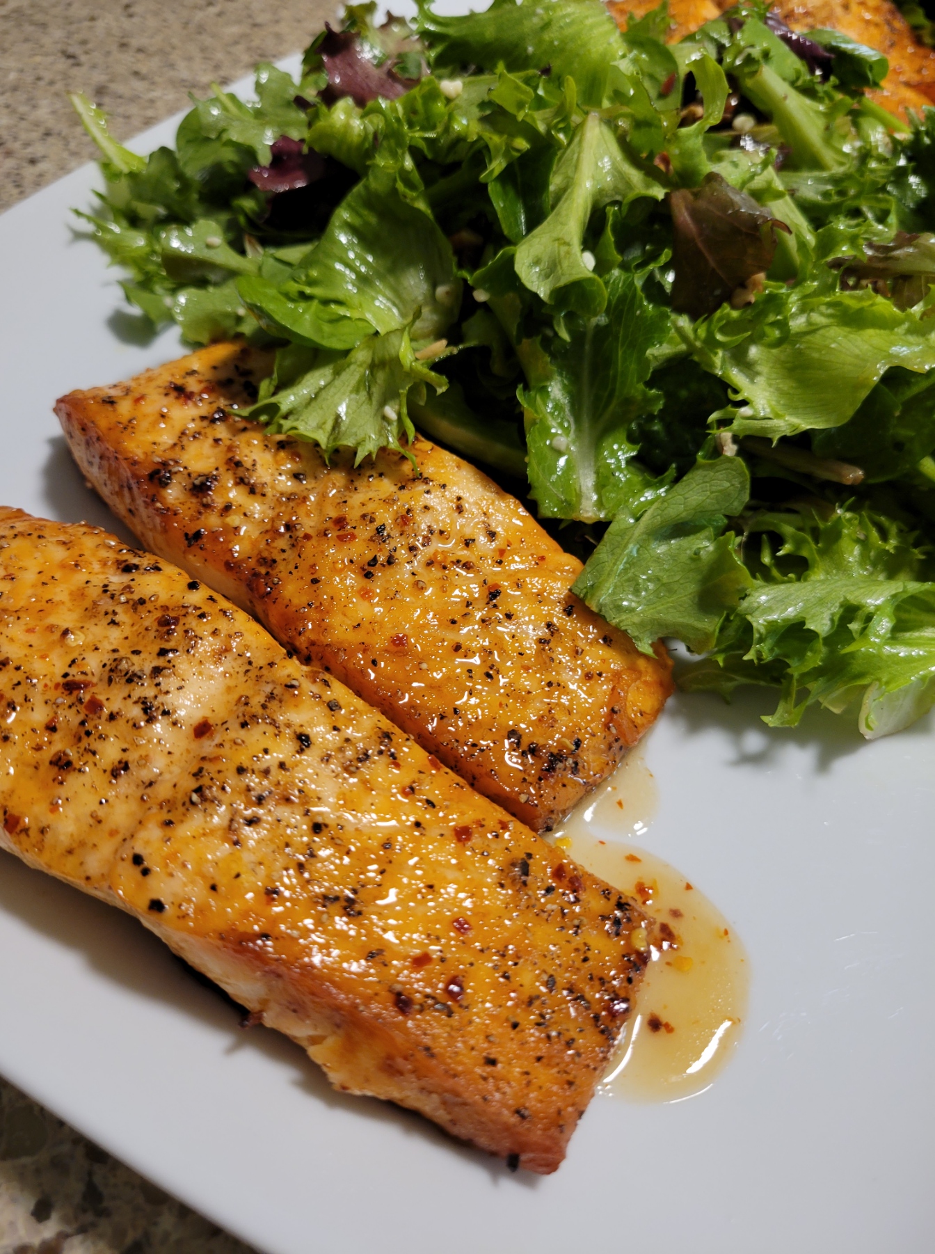 A quick recipe for any night of the week or good enough to serve to company! Sweet, sticky, spicy Air Fried Salmon cooked to perfection! Serve with a salad or mash some potatoes with a veggie or serve over rice